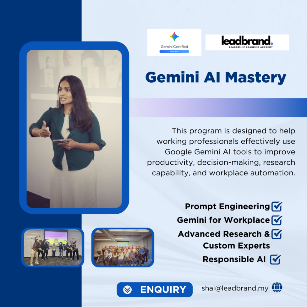“Gemini AI Mastery Program for Working Professionals” is a high-impact workshop designed for the modern Malaysian workforce. This program is designed to help working professionals effectively use Google Gemini AI tools to improve productivity, decision-making, research capability, and workplace automation. Participants will learn practical frameworks to integrate Gemini into their daily workflows including document writing, analysis, presentation creation, data interpretation, and AI-assisted decision support.